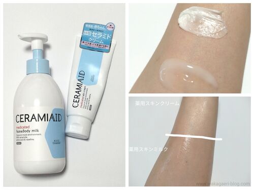 セラミエイドの薬用スキンクリームと薬用スキンミルクの保湿効果や配合成分、テクスチャーの違いについて。塗り心地はもちろん使用直後から翌日までの保湿力を比較してどっちがおすすめなのかもまとめました!