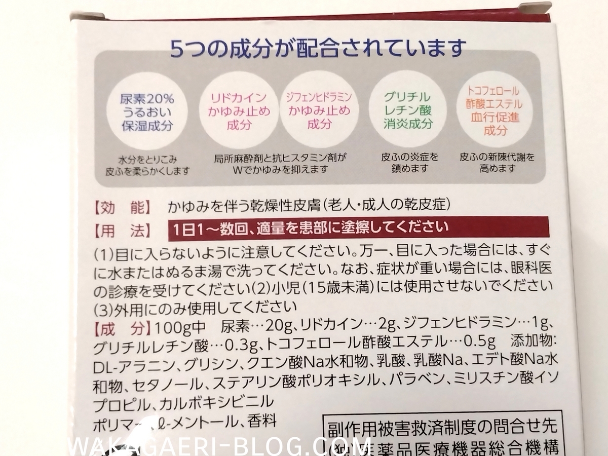 ▼尿素、リドカイン、ジフェンヒドラミン、グリチルリチン酸、トコフェロール酸酸エステル配合